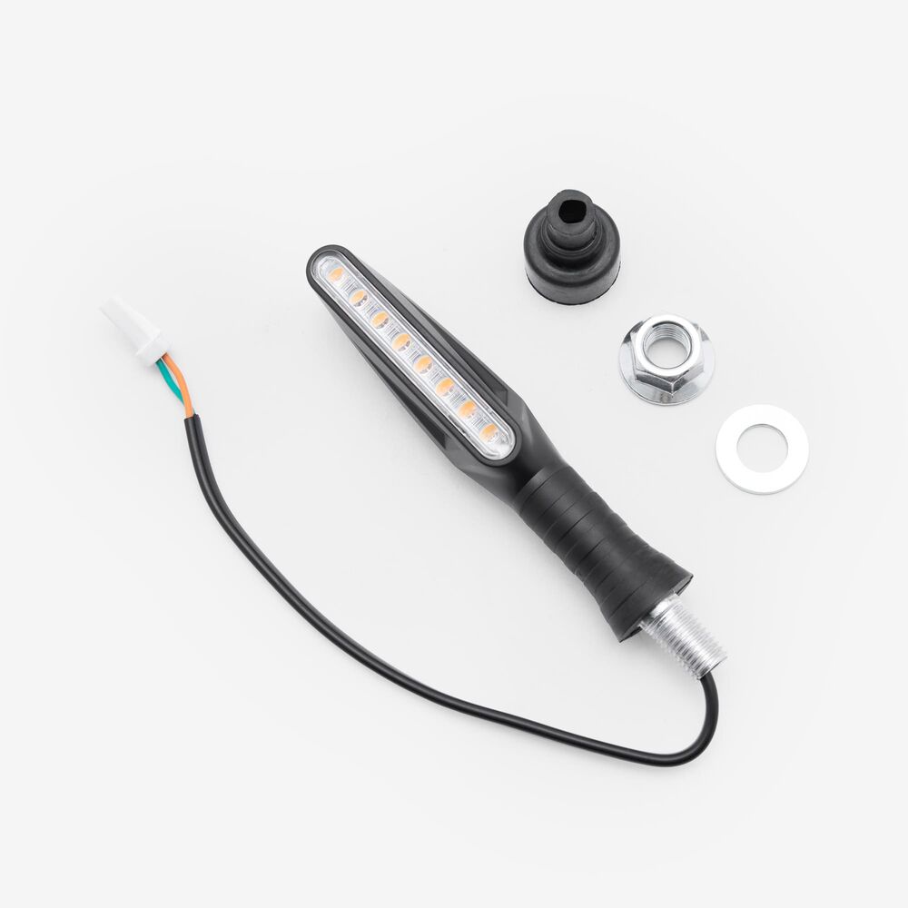 The indicator on a motorcycle is a signaling device used to communicate the rider's intent to turn or change lanes. It typically consists of a light that flashes to alert other road users. Mounted on the front and rear of the bike, indicators are essential for safety, helping to ensure that the rider's movements are clearly visible to others.