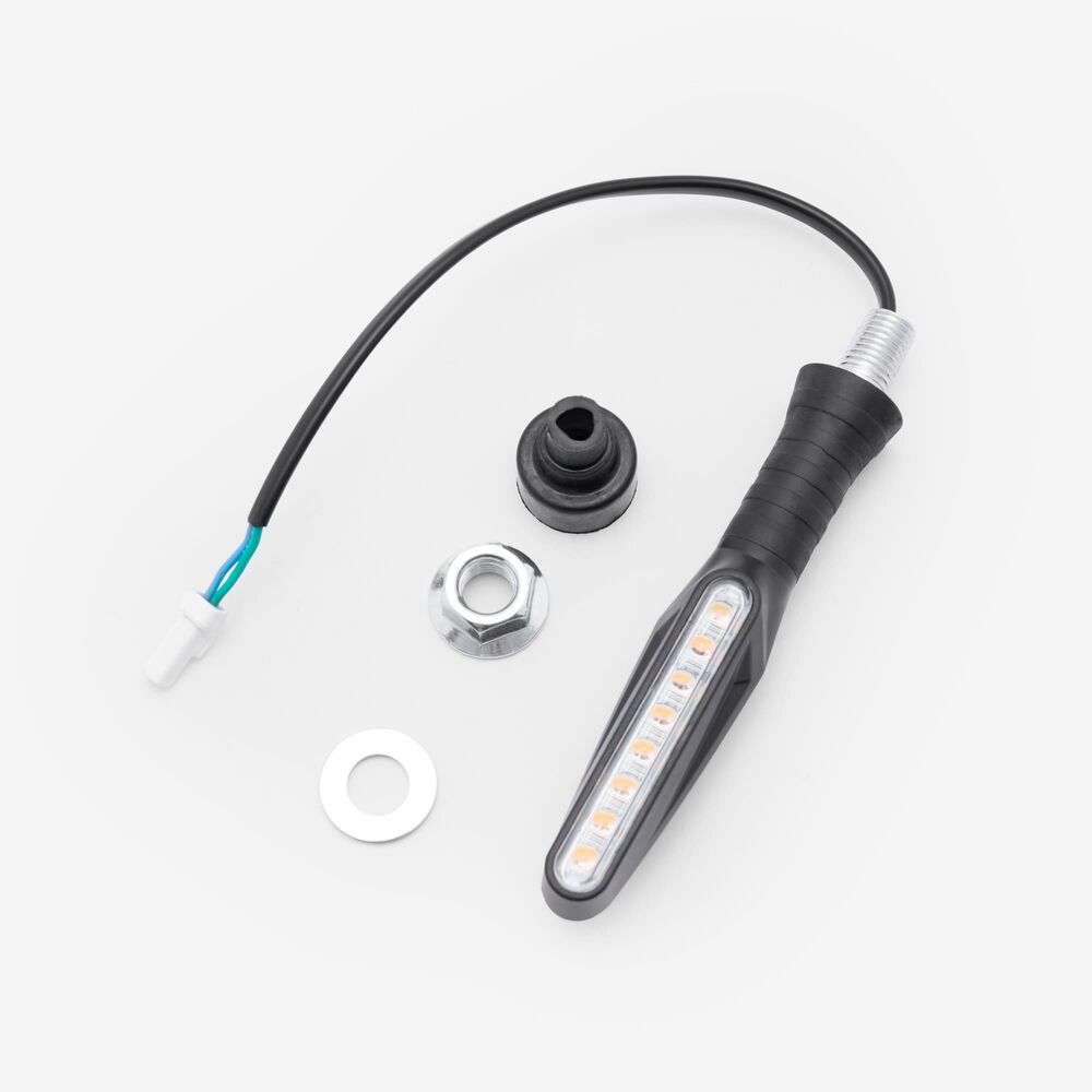 The indicator on a motorcycle is a signaling device used to communicate the rider's intent to turn or change lanes. It typically consists of a light that flashes to alert other road users. Mounted on the front and rear of the bike, indicators are essential for safety, helping to ensure that the rider's movements are clearly visible to others.