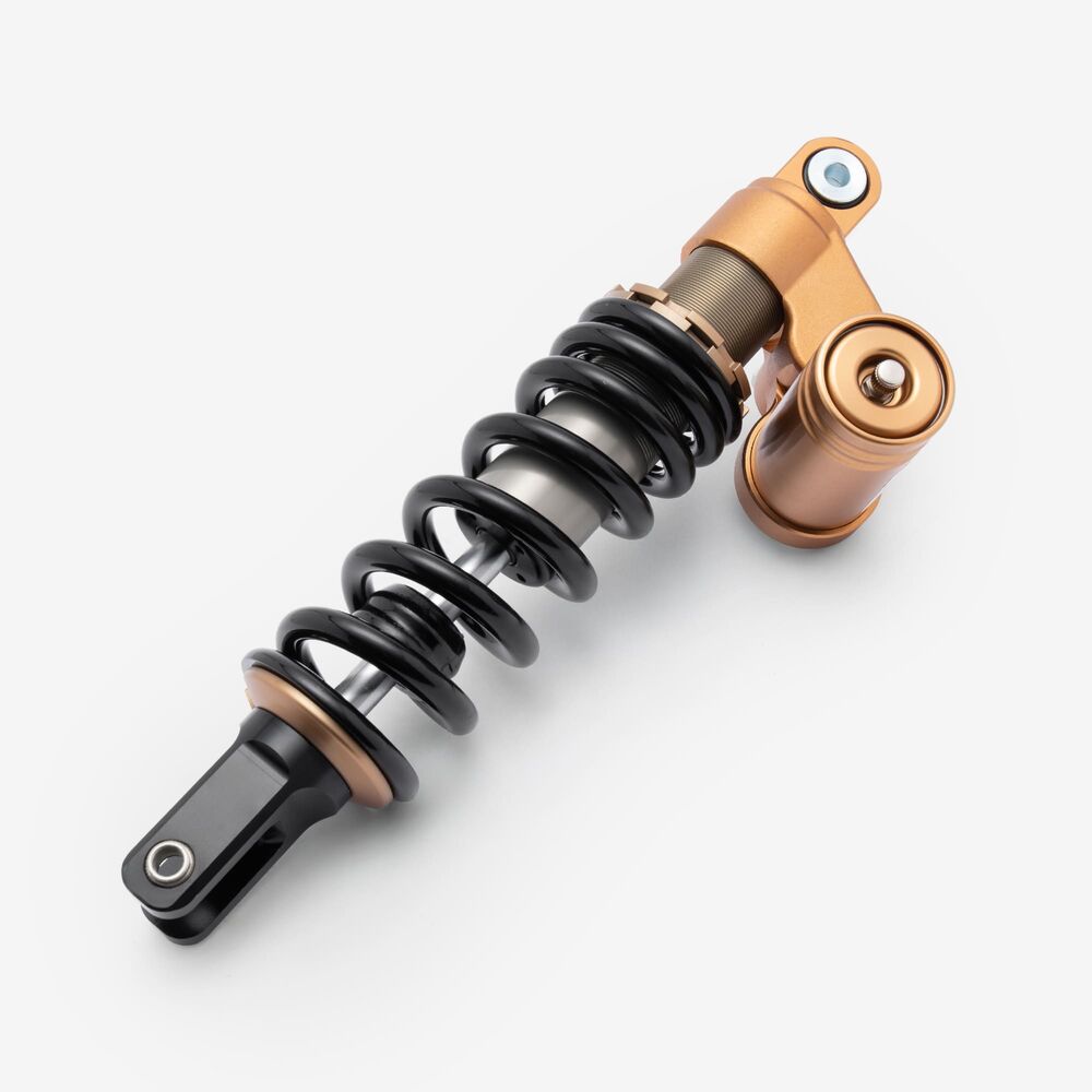 The shock absorber on a motorcycle is a key component of the suspension system designed to dampen and control the impact of road irregularities and vibrations. It absorbs and dissipates energy from the road or trail, providing a smoother and more stable ride by controlling the rate at which the motorcycle's suspension compresses and rebounds. Typically consisting of a piston, hydraulic fluid, and a spring, the shock absorber helps maintain wheel contact with the road, improves handling, and enhances rider comfort.