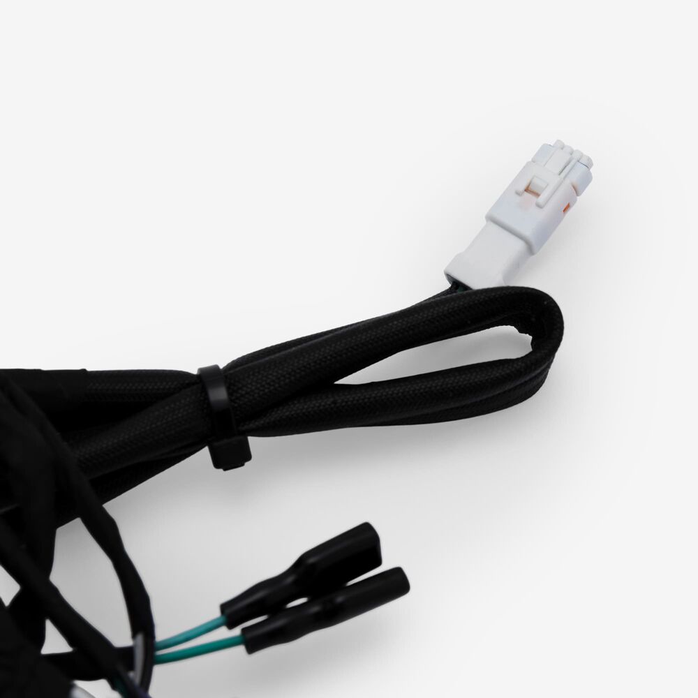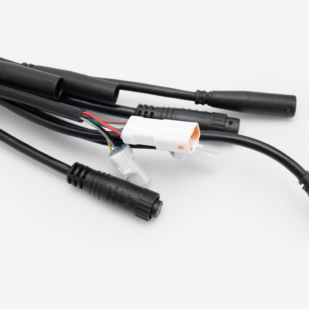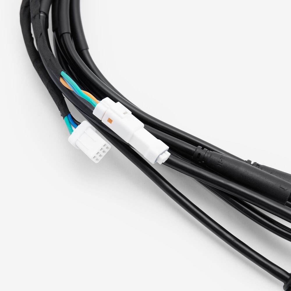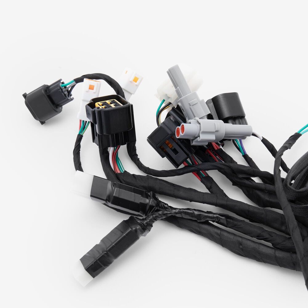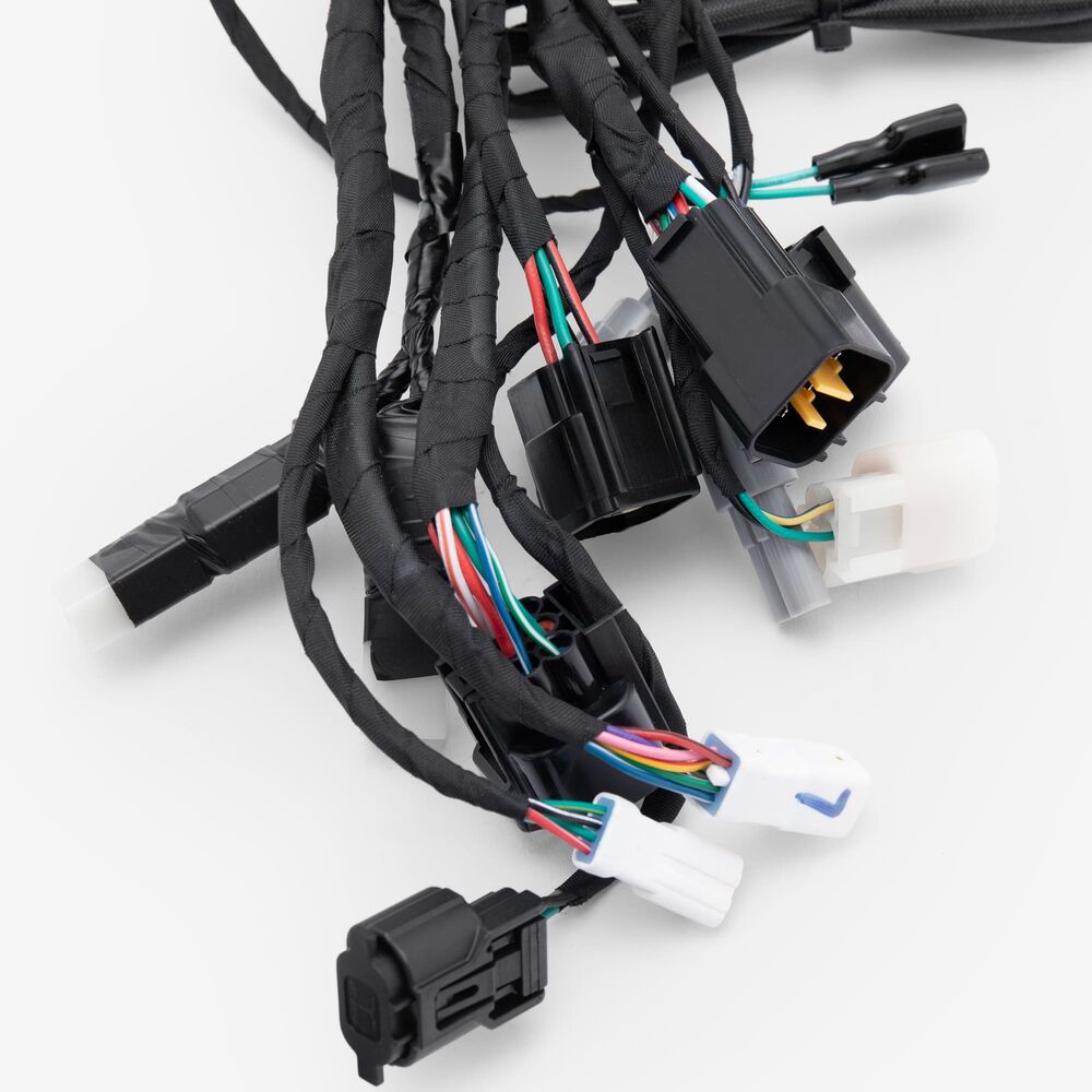 A motorcycle wiring loom, also known as a wiring harness, is a bundle of wires and connectors that transmits electrical power and signals throughout the motorcycle. It organizes and protects the electrical wiring, ensuring connections between components such as the ignition system, lighting, and various sensors. The loom is typically wrapped in protective sheathing to guard against wear and damage, and is designed to streamline installation and maintain a neat, efficient electrical system.